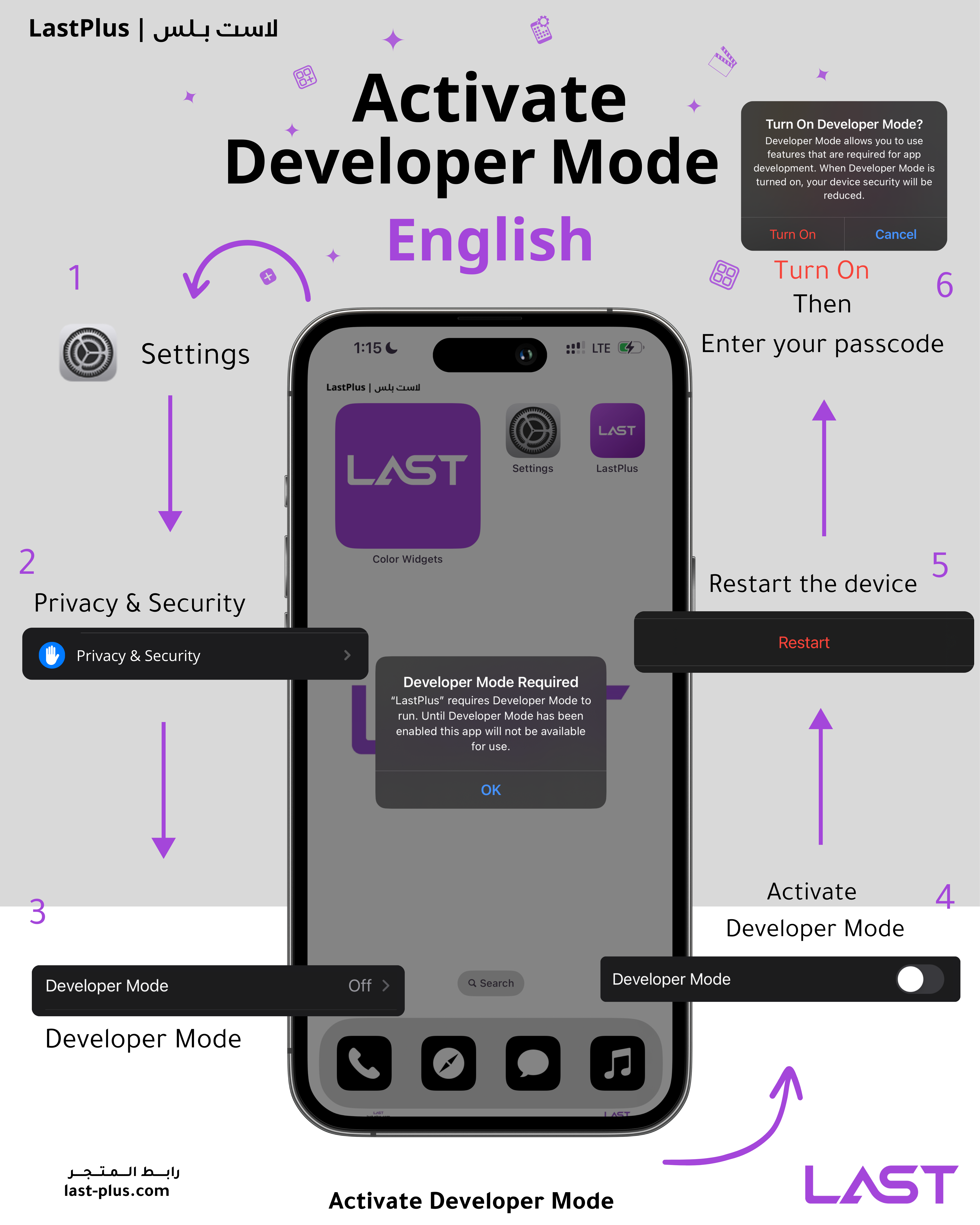 الإعدادات > الخصوصية والأمان > نمط المطور > تفعيل نمط المطور > إعادة تشغيل الجهاز > تشغيل > ادخال رمز الدخول